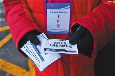 2月7日,天桥北里小区,西城区天桥街道的社区工作者张菲凡在为居民发放出入证。
