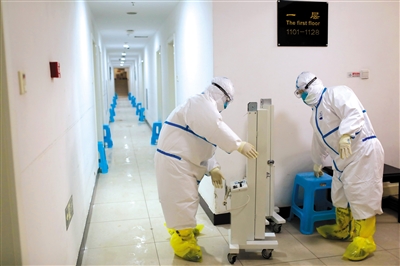 2月21日,服务组在准备紫外线灯对房间进行消毒。