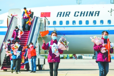 昨天下午,中国疾控中心援鄂队队员结束在武汉的工作,抵达首都国际机场。本报记者 邓伟摄