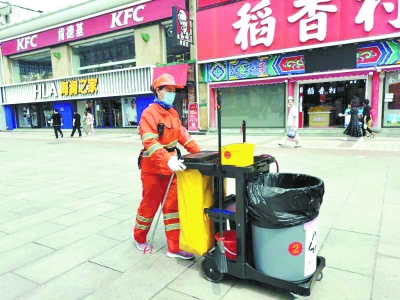 早上8点,北京市王府井地区环境卫生管理所下属丽佳物业公司保洁员洪国芬推着移动保洁车,上岗作业。保洁的第一项任务,是先将地面细细扫一遍。但在正式开始扫地前,洪国芬先在靠近主街东侧的一边,找了个不影响通行的地方,将保洁车稳稳停在路边。