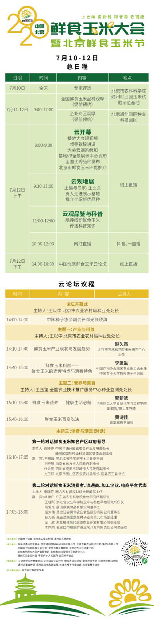 为深入贯彻落实中央1号文件、中央农村工作会议和北京市农村工作会议精神,推进都市型现代农业高质量发展,助力京津冀农业协同创新发展,7月10~12日,2020年中国北京鲜食玉米大会暨北京鲜食玉米节举行,大会以“上云端 尝新鲜 购营养 更健康”为主题,以种业引领服务我国鲜食玉米全产业链升级,促进优质鲜食玉米走进千家万户。