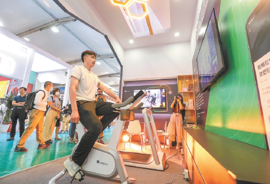 在体育健身文化展区,工作人员正在体验在线与教练互动。本报记者 武亦彬摄