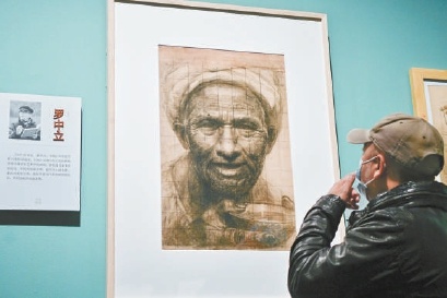 昨天,在国家博物馆,观众认真品味名作《父亲》素描手稿的细节。本报记者 邓伟摄