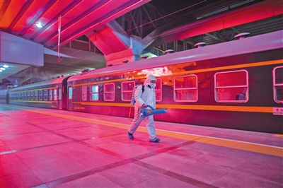 1月27日晚11时,北京站站台,车站工作人员在为站台喷洒消毒剂。