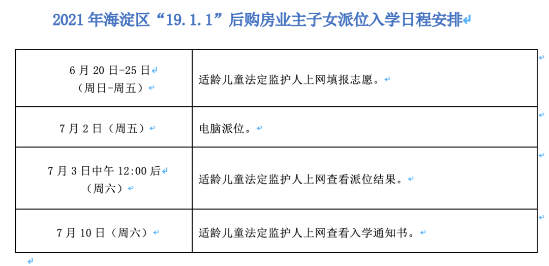 持有海淀区《学龄人口信息采集表》,经过学区、学校核验材料,在符合“六年一学位”政策前提下, “19.1.1”后购房业主子女参加此次派位。