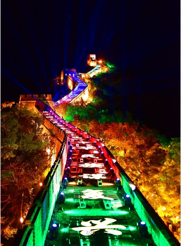 在八达岭长城在北一楼至北三楼通过不同灯光的变化,铺设出500余米长城红毯,16块冰屏组成“为中国人民谋幸福,为中华民族谋复兴”字样依次点亮,让巍巍长城见证百年中国共产党的风华正茂,见证中国共产党始终不渝的初心使命。
