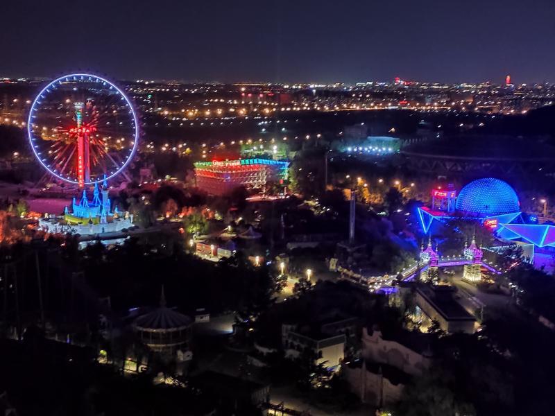 坐落于石景山区游乐园园内的摩天轮,身披“七彩霞衣”,周身流光溢彩,以“热烈庆祝中国共产党成立100周年;百年征程波澜壮阔,百年初心历久弥坚;为中国人民谋幸福,为中华民族谋复兴;不忘初心,牢记使命;永远跟党走”为祝福的主旋律,与园内北京温度、城堡、蓝桥、星座广场、飞越中国、飞越世界等特色景观交相辉映,在炫丽的灯光映衬下,美轮美奂,以其独特的方式热烈庆祝党的百年华诞!