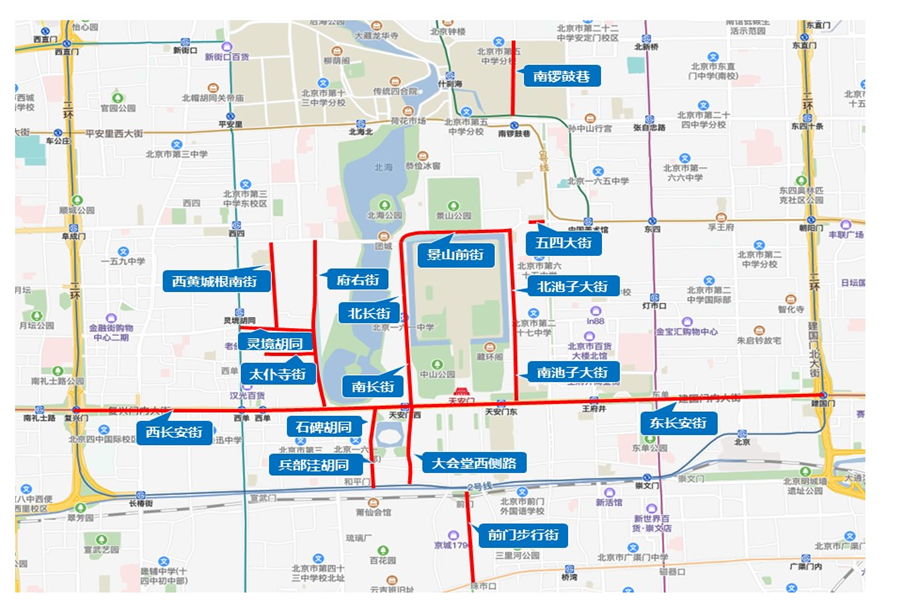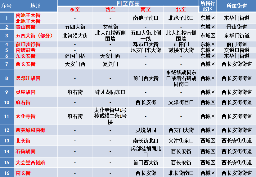 二、首都功能核心区的16个重点区域(包括机动车道、非机动车道、人行步道等的全路段)为互联网租赁自行车禁止停放区域(详见下表及示意图)。