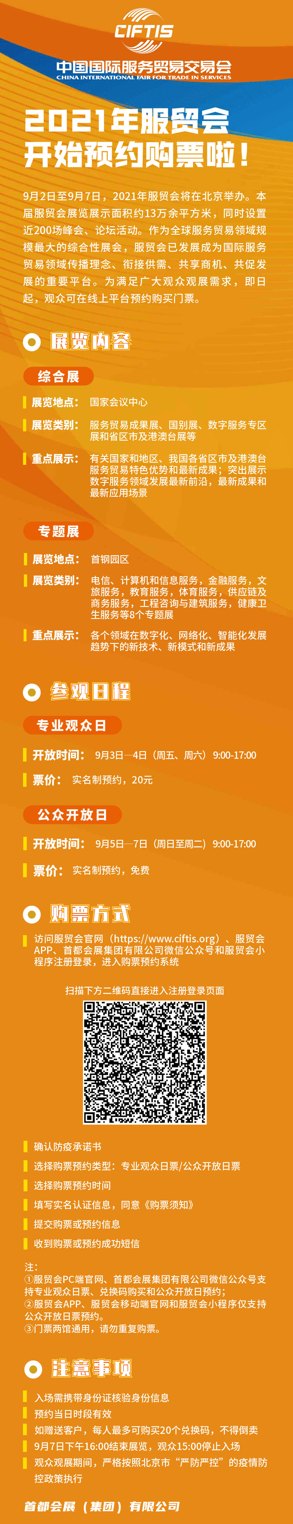 ②服贸会APP、服贸会移动端官网和服贸会小程序仅支持公众开放日票预约。