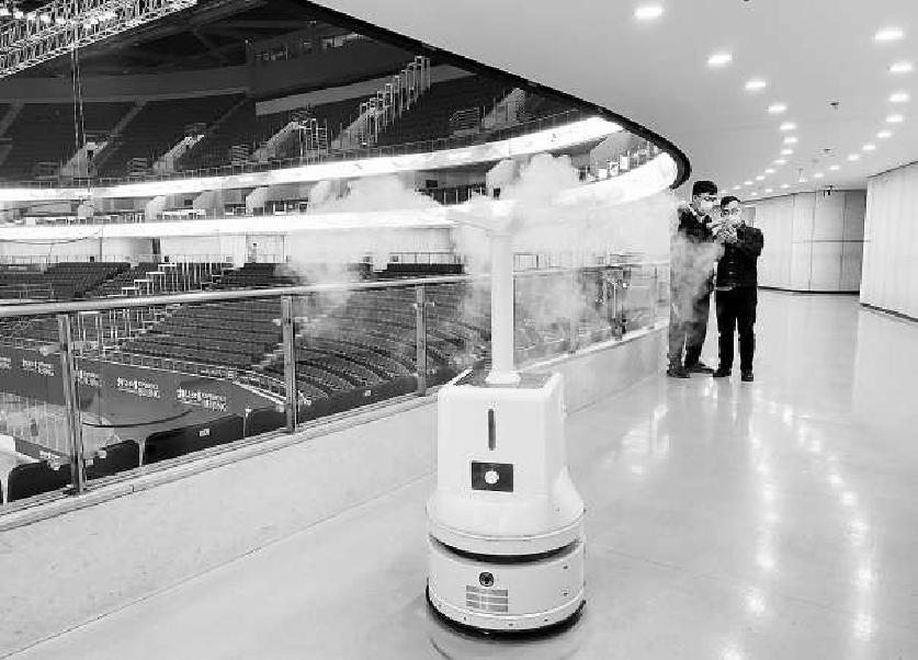 测试赛期间,五棵松体育中心场馆共上岗29台消毒机器人,包括27台雾化消毒机器人,2台紫外线消毒机器人。