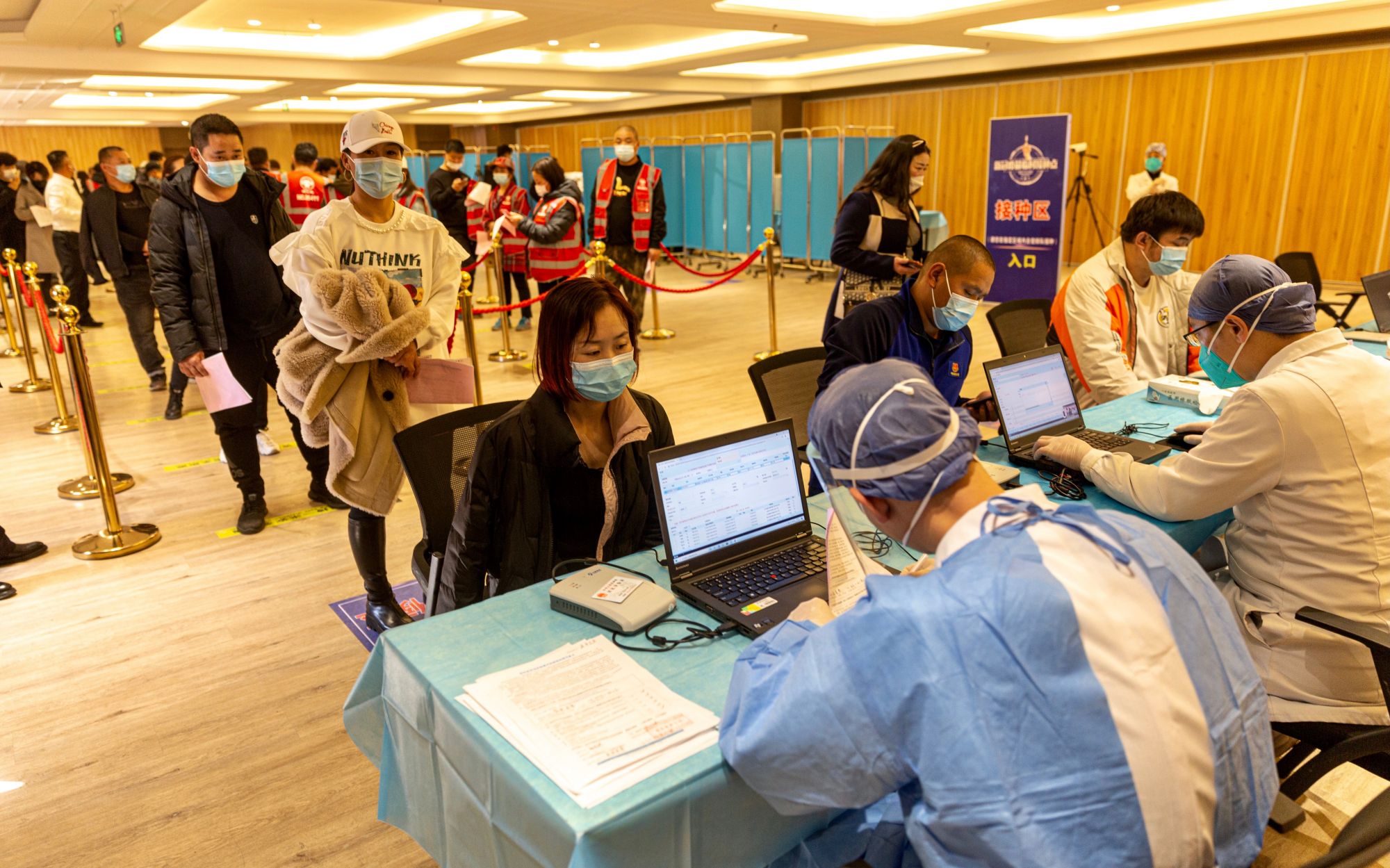 新发地市场商户与员工们排队登记个人信息,准备接种疫苗。新京报记者 郑新洽 摄