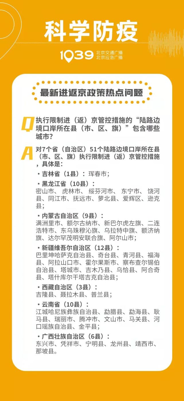 14日内有陆路边境口岸所在县(市、区、旗)旅居史人员非必须不进(返)京。执行限制进(返)京管控措施的“陆路边境口岸所在县(市、区、旗)”包括以下这些城市。