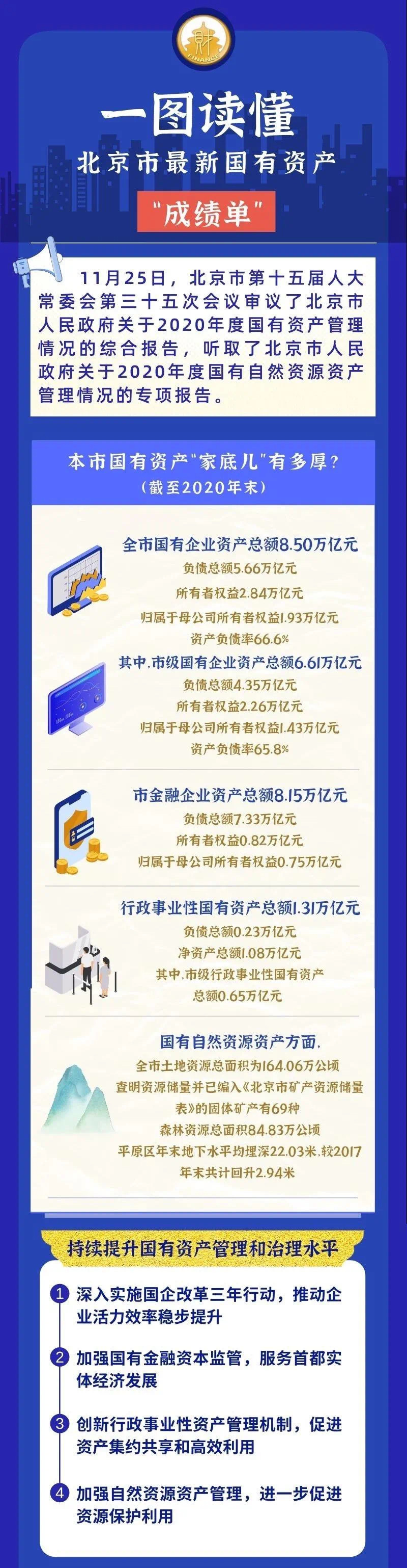 央广网北京11月30日消息 据北京市财政局消息,《北京市人民政府关于2020年度国有资产管理情况的综合报告》显示,截至2020年末,北京市国有企业资产总额8.50万亿元,负债总额5.66万亿元,其中,市级国有企业资产总额6.61万亿元,负债总额4.35万亿元。市金融企业资产总额8.15万亿元,负债总额7.33万亿元。