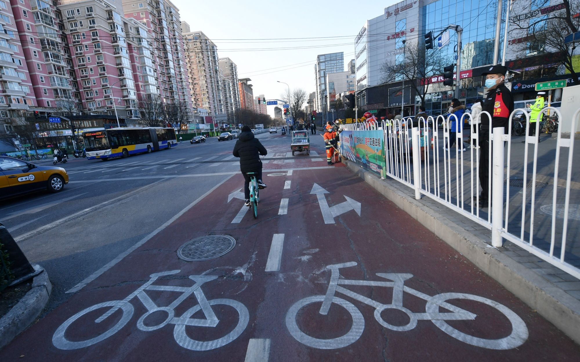 非机动车道也进行了拓宽,左转自行车有了独立的等候空间。新京报记者 王贵彬 摄