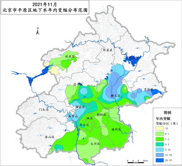 受降水丰沛和生态补水影响,9月至11月期间,全市16个区地下水水位普遍回升。根据11月底的最新统计,回升值大于5米的区域占平原区总面积的32%;回升值大于10米的区域主要分布在向阳闸以上潮白河沿线周边地区和平谷山前区域。截至目前,回升最大值出现在平谷区南独乐河监测站,回升值为30.21米。
