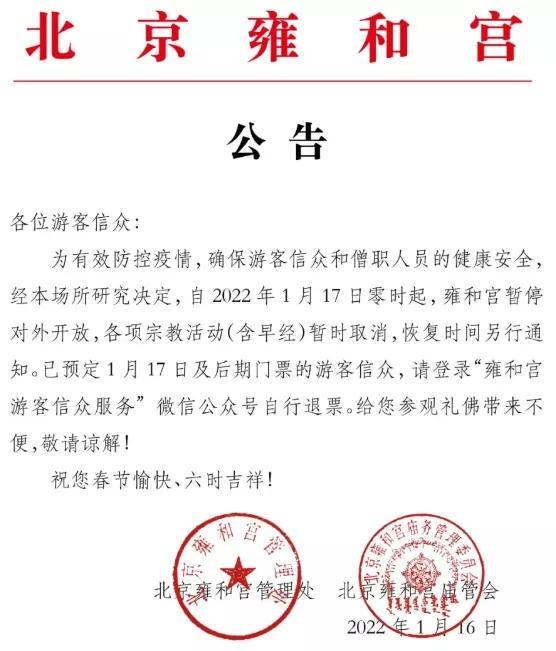 据雍和宫游客信众服务微信公众号消息,为有效防控疫情,确保游客信众和僧职人员的健康安全,自2022年1月17日零时起,雍和宫暂停对外开放,各项宗教活动(含早经)暂时取消,恢复时间另行通知。