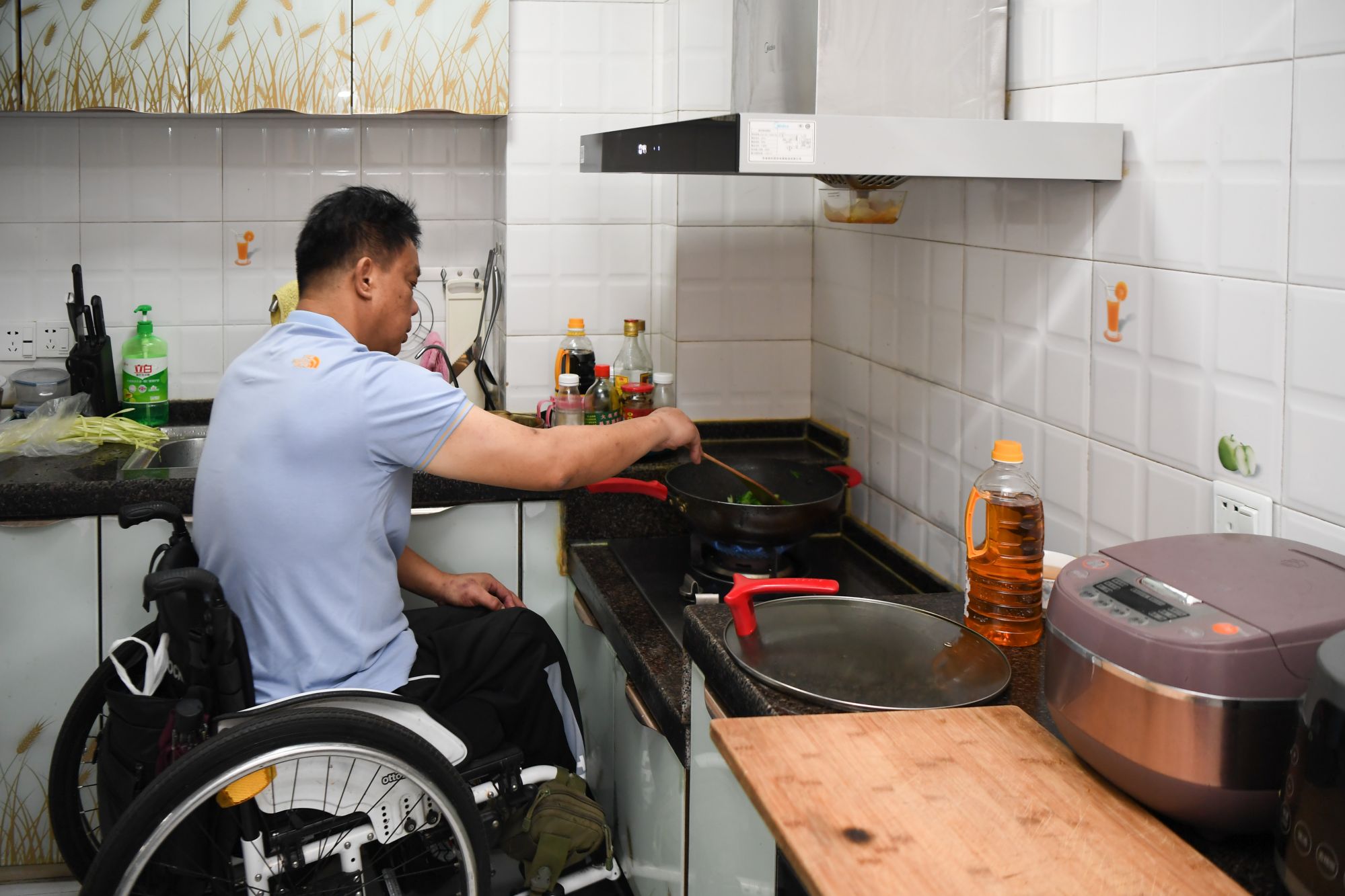 2021年8月25日,一位残疾人在湖南省长沙市天心区家中的定制低位灶台上炒菜。新华社记者 薛宇舸 摄