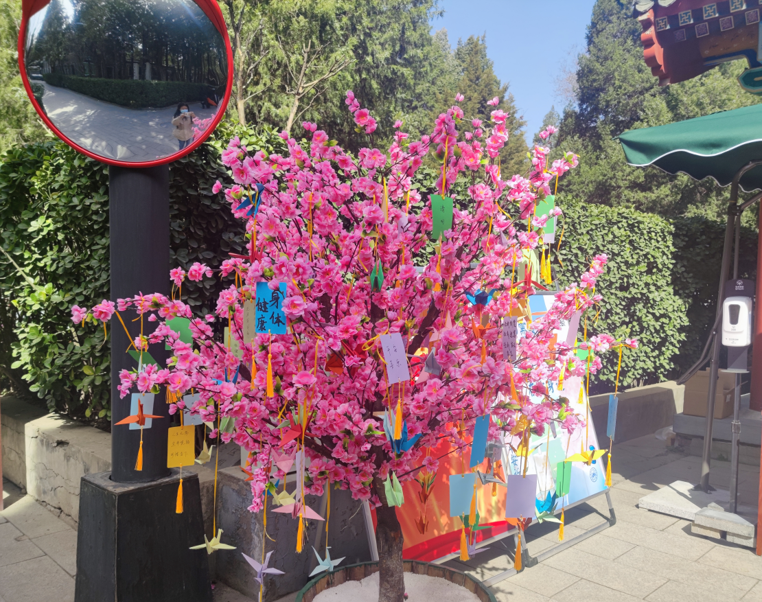 “亲人安康,故人安息”“清明相思,祝福亲人”“思念亲人”……在抒怀堂外,市民们纷纷在小纸片上写下对亲人的思念和对未来的祝福,系在有千纸鹤的祈愿树上。