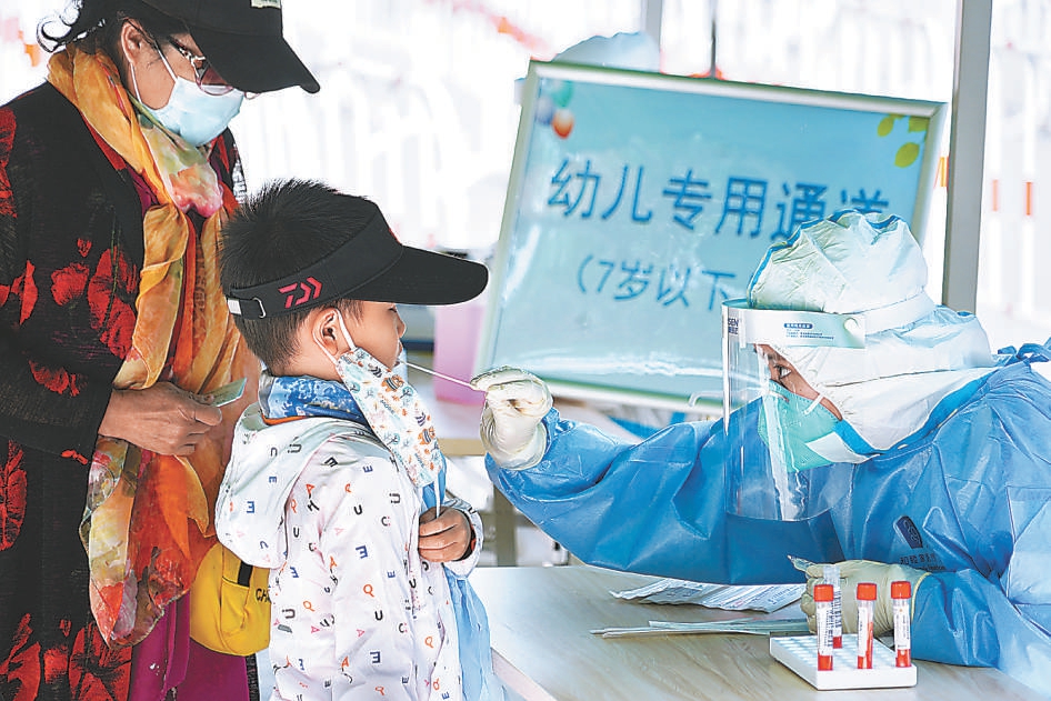 昨天(5月7日),朝阳区启动新一轮大规模核酸检测。为方便居民进行核酸采样,减少交叉几率,朝阳区小关街道奥林匹克文化广场核酸检测点设置“幼儿专用通道”,专为7岁以下儿童提供核酸检测服务。本报记者 程功摄