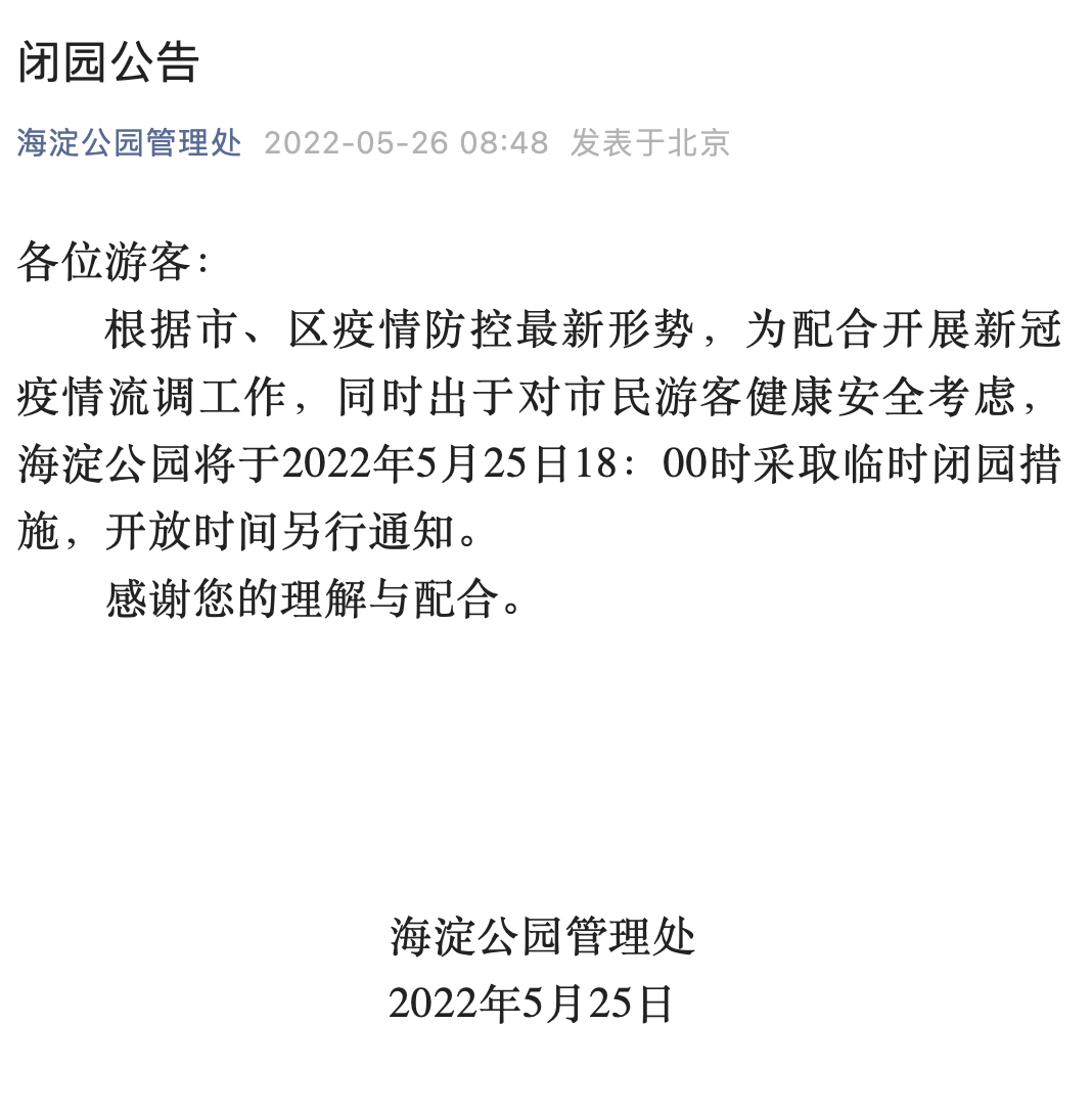 据海淀公园管理处官微消息,根据市、区疫情防控最新形势,为配合开展新冠疫情流调工作,同时出于对市民游客健康安全考虑,海淀公园将于2022年5月25日18:00时采取临时闭园措施,开放时间另行通知。