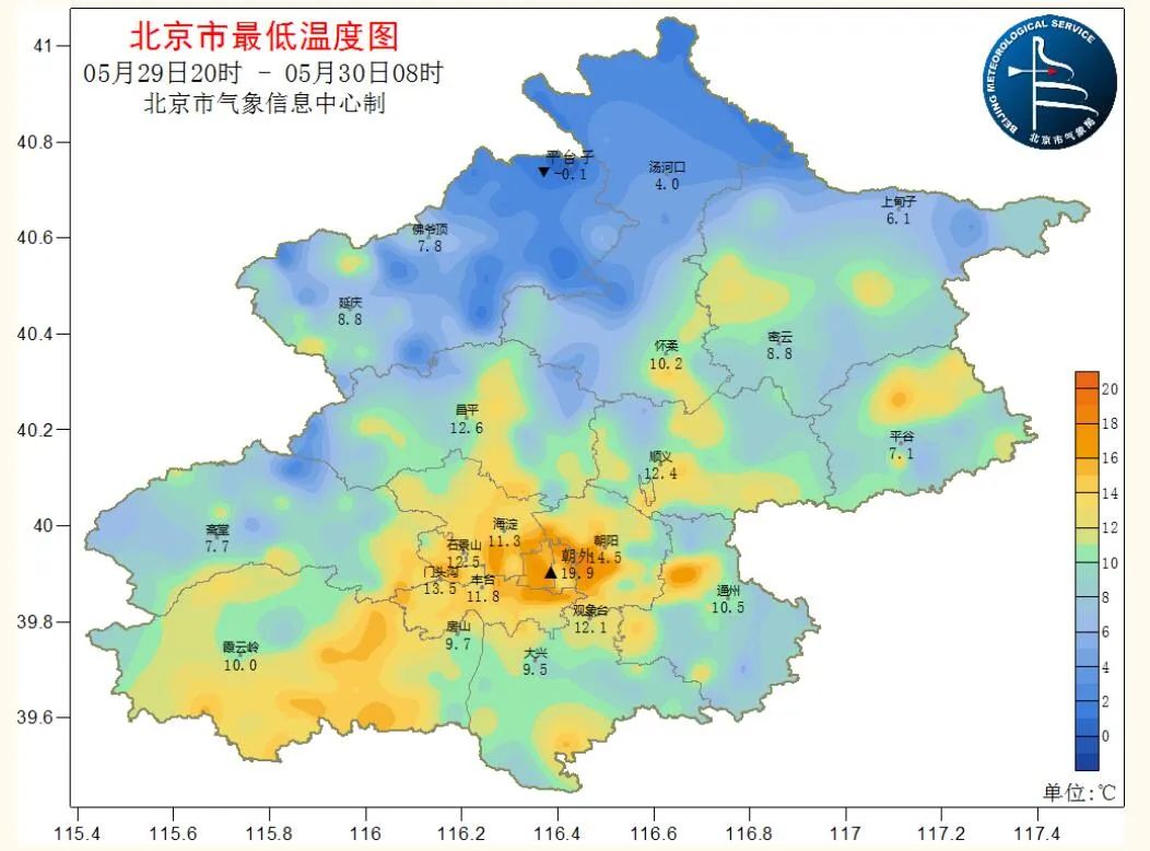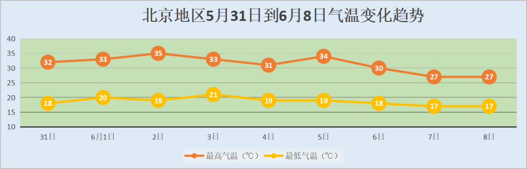 预计从5月31日到6月8日南郊观象台最高气温27℃~35℃,最低气温17℃~21℃。