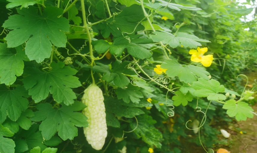 苦瓜商品性要求:具有品种固有的典型风味和营养特征,成熟度适宜、瓜条整齐一致,瓜体笔直弯度在 0.5cm 以内;圆润无尖,棒状瓜条,齐头,钝尾,色泽新鲜、刺瘤坚挺,瓜皮拥有品种固有颜色,油亮有光泽,果肉厚,果腔小,果实发育均匀,质地脆嫩;无病虫害,无疵点,无冻害,无损伤,不萎蔫。苦瓜果皮的瘤状突起类型较多,果实形状多样,品质差异大,生产者应根据销售渠道特点,在选择适宜品种的基础上,合理密度,增加采收频率,达到适时采收,使苦瓜保持较佳的商品性和较高的成品率。夏季光照强、气温高,非常适合苦瓜的生长。应施足底肥,适时追肥,及时去除老叶、黄叶和病叶,创造通风透光的生长环境,增强光合作用,保持适宜的水分,防止植株早衰,延长苦瓜采收期,保持商品性。