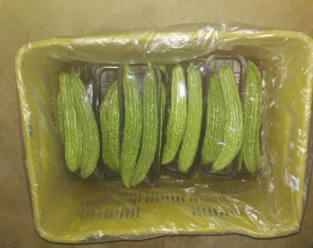 多数苦瓜品种整齐度较差,进行分级销售,既能提高包装美观度,也能促进产品优质优价。苦瓜包装分为田间采收包装和销售包装两种方式。田间包装应以能避免瓜条间发生机械损伤为原则,可用包装纸包裹等方法进行预防。销售包装应根据销售渠道特点选择合理的包装方式,目前主要包括保鲜膜包裹、槽型盒、套袋等方式。白玉苦瓜等果皮薄、水分含量高的品种,更易出现蹭伤,包装材料型号应与苦瓜规格相匹配,同时使用网套等进行保护,既可提高产品美观度,又能减少机械损伤,降低损耗率,保持较好的商品性。套袋栽培为苦瓜新型包装方式,它把二次包装变为一次包装,降低了包装成本,同时成品率提高、整齐度提高。