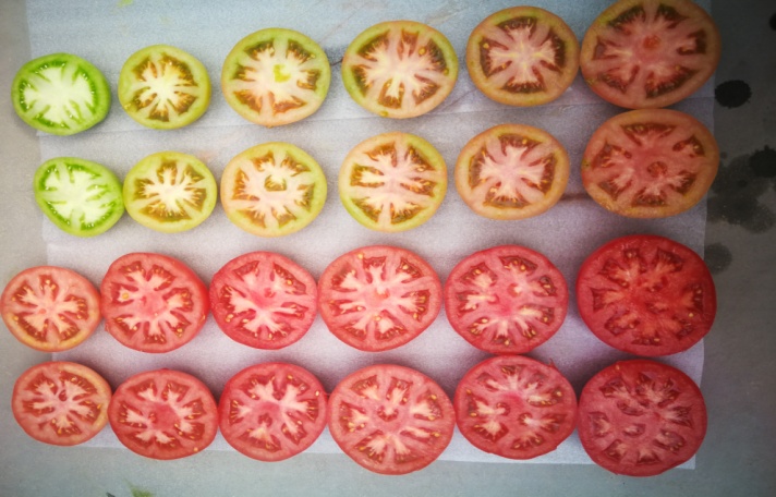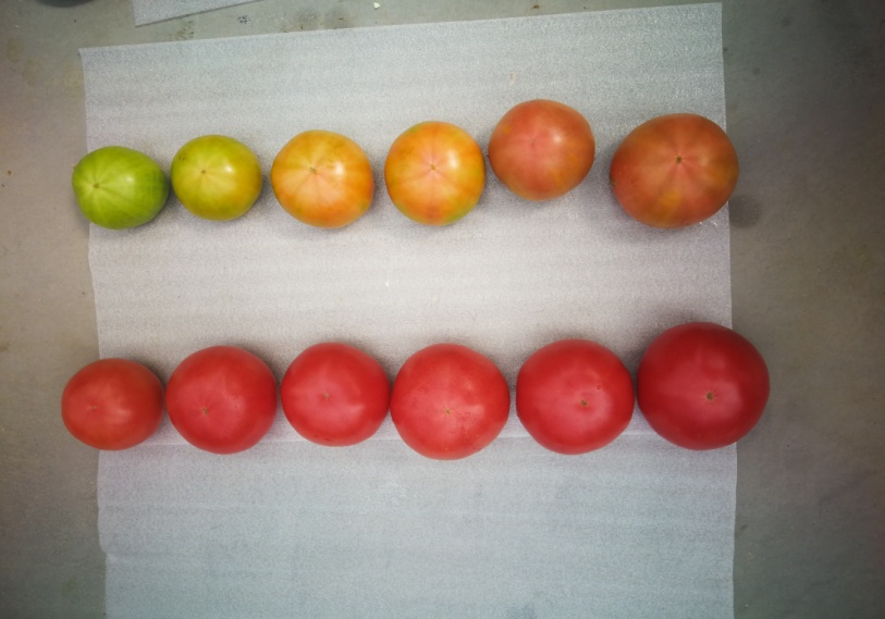 番茄采收标准与品种、销售距离、销售方式有关。判断适合采收的依据,以到达终端消费时,番茄品相最佳、品质最好为原则。应根据品种特性、食用方法、销售方式、销售距离,采后直接销售还是需要贮藏,制定番茄采收标准。薄皮番茄应适当降低采收成熟度,减少裂果现象;夏季果实转色时间短,采收集中,销售压力大,如不能及时销售,应按照贮藏要求确定采收标准。夏季番茄过早采收,硬质番茄果肉硬、品质差,薄皮品种番茄风味淡,水果番茄品种可溶性固形物含量低,口感差。番茄采收成熟度一般控制在四至八成熟采收,具体根据品种类型、食用方式、销售方式决定。采收应在无雨水、露水干后采收;手接触会造成果皮和果肉内部发生变化,采收时应配戴手套。