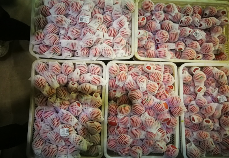 番茄包装方式多样,应根据品种特点、销售方式选择合理的番茄包装方式;使用的包装材料型号应与番茄规格匹配,既可避免机械损伤问题发生,也能避免包装材料浪费,降低包装费用。气调包装为新型包装方式,通过调节不同比例的气体,最大限度抑制番茄呼吸强度,从而延长番茄货架期。电商销售的番茄,包装方式应重点关注破损问题,以及避免挤压造成的腐烂问题发生。夏季分选、加工、包装等工作时,应配戴手套,可避免手温过高造成番茄内部损伤,利于保持番茄商品性。