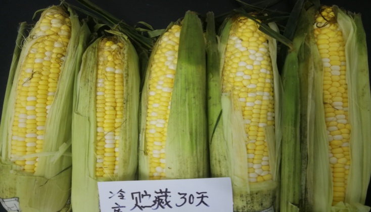 甜玉米采收期正处于高温季节,天气晴朗的情况下,上午10时采收的菜体温度可达27℃以上,而甜玉米20℃以上极易造成糖分转化,温度高糖分转化更快。为了保证品质,可采用真空、冷库、差压、冰水等预冷方式,也可采用冰袋等辅助降温措施,其中以真空预冷方式降温速度最快,降至要求温度一般只需 20~30min,可采取包装或加水方式,减少预冷过程中的失水问题;冰水预冷方式降温速度快,苞叶比其他预冷方式能多吸收一部分水分,此预冷方式更利于甜玉米保鲜。预冷时间应以甜玉米芯中间温度降至要求的温度为准。通过预冷能快速降低甜玉米温度,延缓糖转化为淀粉的时间,从而降低贮运销环节的损耗率。带苞叶预冷和贮藏,利于保持甜玉米籽粒果皮的光泽。保持苞叶适宜含水量,利于籽粒保持光泽,利于保持籽粒含水量和可溶性固形物的稳定。甜玉米长途运输多在采用冰水预冷后,再加入一定比例碎冰的方式,保持运输过程甜玉米温度。甜玉米和碎冰重量比例与运输时间长短有关。甜玉米适宜的保鲜温度为 0℃,湿度为 90%~95%。保持低温和高湿,是保证贮、运、销环节甜玉米品质的关键。