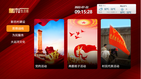 智慧乡村生活圈,是2019年3月上线的一档电视端服务应用,是根据通州区张家湾镇皇木厂村具体工作需求,基于歌华有线云平台,为皇木厂村构建的智慧乡村电视云服务平台,增强了村委会与百姓间的联系互动、为乡村发展建设提供了新模式。