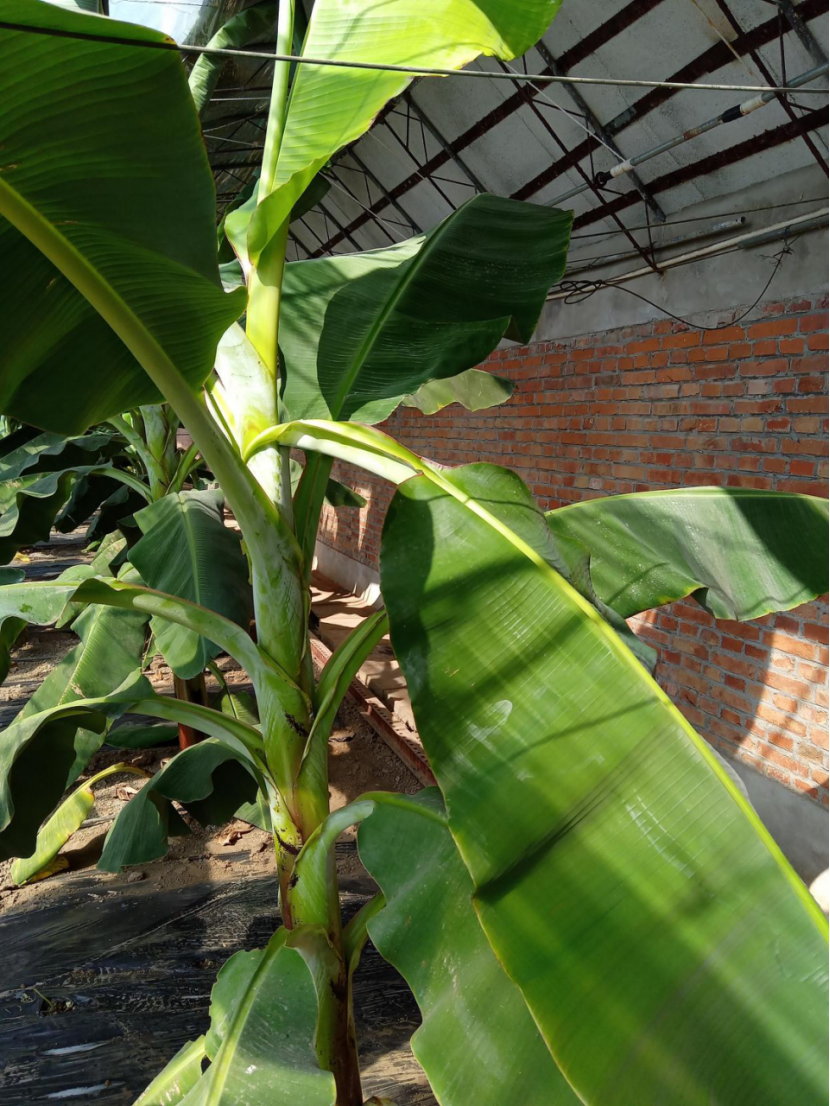 香蕉触及棚膜时及时拉弯或折断叶柄