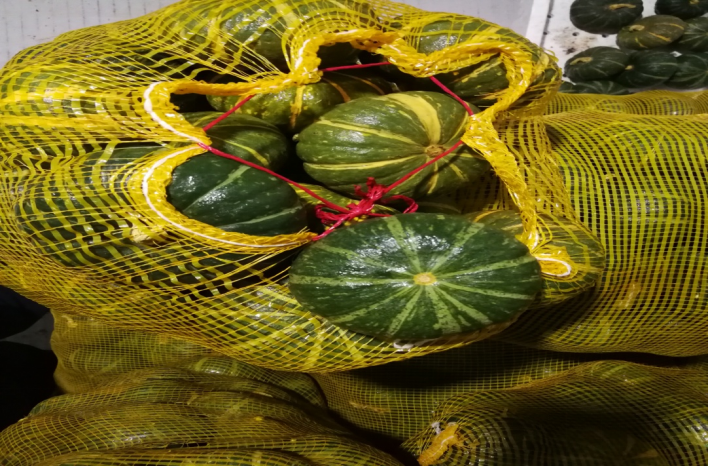 预贮工作包括分级、伤口愈合、入库整理三个环节。分级:对收获的南瓜剔除病瓜、烂瓜,并按照大小、成熟度进行分级。伤口愈合:分级后把适合贮藏的南瓜存放在温度较高、通风的地方,码放高度一般不超过2m,宽度不超过1m,两排之间留有20cm 通风道,预贮温度为15-25℃,预贮时间为 7-15日,通过预贮使南瓜果面及果柄伤口愈合,部分成熟度略低的南瓜果皮完成硬化,耐贮性能提高。入库:把适宜贮藏的南瓜入库,包装方式、码放方法与贮藏效果有关。贮藏时可采用塑料编织袋、网袋、塑料筐、纸箱等包装方式,也可不用包装物直接码放,但底部需垫物,不能直接接触地面。