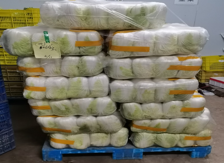 出库销售前,对贮藏的娃娃菜进行加工,去除外叶见到新叶,达到商品性要求,重量一般以三棵500克为宜。应根据销售渠道和配送方法选择适宜的包装方式。娃娃菜包装方式简单,主要有保鲜膜包裹、包装盒、包装袋等方式。使用通透性好的0.01毫米厚度PEPO膜包裹保鲜效果最佳,既能避免机械损伤,又能预防娃娃菜失水萎蔫,保持娃娃菜脆性作用。袋装娃娃菜多采取三棵为一包装,标重500克。个体略大的娃娃菜也可做中型白菜销售,减少加工工作量。包装数量大时,可采用半自动、自动包装机械进行包装,机械加工效率高,劳动强度低,长期使用经济效益好。