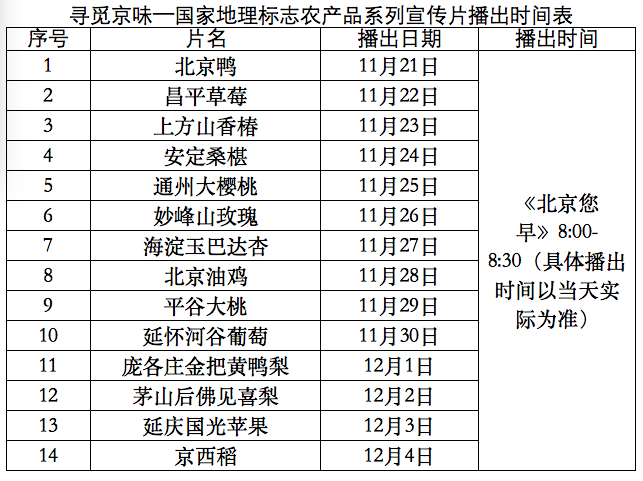 《寻觅京味》是一档由北京农产品质量安全中心、北京广播电视台新闻频道联合推出的国家地理标志农产品系列节目,将于11月21日起《北京您早》8:00-8:30(具体播出时间以当天实际为准),精彩呈现!