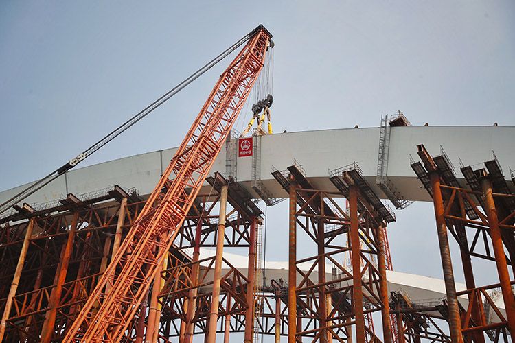 为了方便加工制造和吊装,全桥钢结构共分成126个形态各异的钢“积木”,最重的单个240吨,最大长48米、宽9米,采用两台200吨级液压模块车进行运输。