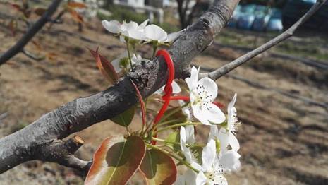 那么,这种迷向散发器怎么使用呢?正常情况下,迷向散发器在田间的持效期有6个月左右,一个生长季只需要悬挂一次。每次每亩悬挂40根,根据每亩果树数量平均交叉悬挂,也可根据实际果园内虫口密度的大小,悬挂数量相应的增大或减少,但每亩悬挂数量不少于35根;注意在整个防治区外侧边界,坡度较高和主风方向边缘处2-4排树(根据地块大小调整)加倍悬挂。使用迷向散发器防治梨小食心虫,抓住防治适期很重要。应该在越冬代成虫羽化前,虫口密度较低时开始使用,一直到第三代成虫羽化结束,北京地区一般是4-9月份。迷向散发器应用面积应该在50亩以上,且面积越大效果越好。