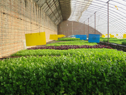 8、病虫监测和预防:苗棚要覆盖50目以上防虫网,防止烟粉虱、蚜虫等小型害虫传入;悬挂黄板,监测小型害虫的发生情况并可以起到诱杀作用;喷施海藻素、植物免疫蛋白等诱抗剂,促进植物生长,增强种苗抗病性。