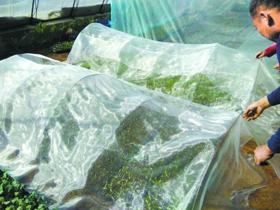 近期正值春茬蔬菜育苗期,走进昌平区新百善农业园种植基地,只见辣椒、番茄、茄子幼苗整齐茁壮、长势喜人,而育苗技术员小高正拿出一个透明玻璃瓶,往苗床上撒出一只只绿色的小虫子。这些小虫子有的看起来像蚂蚁,迅速在幼苗叶面上爬动;有的长有翅膀,直接从瓶口飞到了苗床上。育苗最要紧的就是无病虫育苗,育苗棚内仔细布置的防虫网和粘虫色板也是为了防止害虫的侵入,这怎么反倒往苗床上撒虫子呢?原来,这是该基地今年从市植保站新引进的天敌昆虫——烟盲蝽,它能吃粉虱,还能吃斜纹夜蛾等害虫的小幼虫。虽然现在没粉虱,但这个天敌比较特别,现在释放它不是为了让它吃害虫,而是为了能“种”出更多的天敌来,等到苗子定植到大棚后,它们就可以防害虫了。