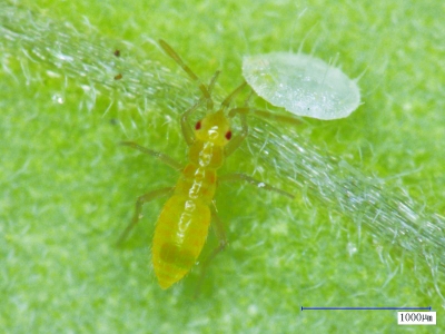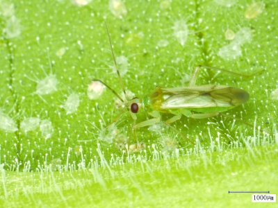 据市植保站天敌专家介绍,烟盲蝽是近年来在我国生物防治领域引进的一种杂食性天敌昆虫。它是一种不完全变态的昆虫,成虫和若虫均可捕食粉虱、斑潜蝇以及鳞翅目昆虫的卵和初孵幼虫等农业害虫,是一种利用潜力巨大的捕食性天敌。烟盲蝽在我国引发关注是它最初被当作烟草上的一种害虫。因为烟盲蝽作为一种杂食性昆虫,它既需要取食其它昆虫作为食物来源,还要刺吸植物的汁液补充营养,二者缺一不可。烟盲蝽在若虫期喜欢聚集在烟草的嫩枝嫩叶上吸食汁液,对烟草的质量造成不良影响,因此,在我国的烟草种植地区烟盲蝽是一种植食性害虫。
