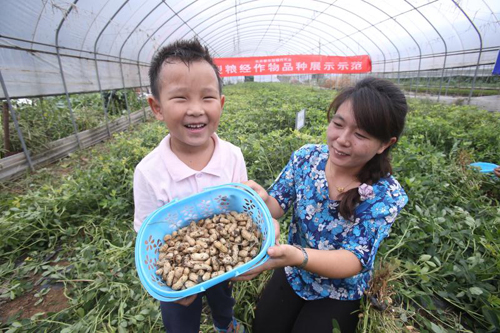 “麻房子红帐子,里面住着个白胖子。”讲的就是花生。在顺义区北京野谷健康产业有限公司的生态园里,记者看到,长满绿油油叶子的花生地里,一个带孩子的老人正低头顺着花生的叶脉往起拔,旁边的小孩手舞足蹈,等着摘花生。只听“噗”一声,白花花的花生冲土而出。“哇!”好大一窜花生,大大小小有几十颗,成熟的粒大饱满,嫩的晶莹雪白,可好看了。孩子用嫩嫩的小手往篮子里摘花生,一边摘一边往嘴里送,‘’好吃,爷爷。‘’拔花生,摘花生,偶尔也会因为被蚂蚁咬而躲一下脚。大人和孩子的每一个动作,每一句谈话,每一滴汗水构成一幅画。当时太阳已经很猛烈了,这一老一小直到把装花生的1个筐装满才离开土地。
