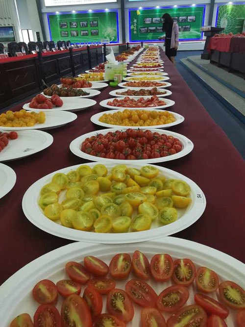 鲜食番茄擂台赛,共有来自京津冀、宁夏、辽宁等省市共计61个园区报名参赛,经初选后,参赛样品139个,参赛品种100余个,将按照大果型、中果型、樱桃番茄三种类型,由蔬菜领域的专家分别评选出擂主奖、一等奖、二等奖、三等奖、优秀奖。大众评审团选出最受市民喜爱的番茄奖项。北京的大番茄粉果高米高、北菜园1号、中型番茄京彩6号、原味1号,樱桃番茄金宝、凤珠等;天津的大番茄普罗旺斯、小青,中型番茄春绿-1、嘎啦果,樱桃番茄昌粉二号等等;河北的大番茄咏美3号、番茄313,中型番茄高糖、咏美2号,樱桃番茄福特斯、粉樱六号等等一一亮相。最终擂主奖是天津市滨海新区永丰蔬菜种植专业合作社(大果型品种—小青)、北京凤采军辉农产品产销专业合作社(中果型品种—草莓二号)、北京百旺农业种植园(樱桃番茄品种—日本黄樱桃番茄1号)获得。最受市民喜爱奖的品种:大果型品种—喜洋洋、咏美3号小青;中果型品种—番小青、京采6号、亲喔二号;樱桃番茄品种—福特斯、玉女、日本黄樱桃番茄1号。