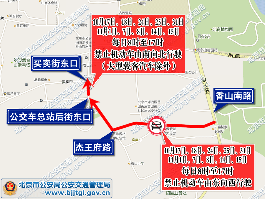 2、杰王府路由香山南路至公交车总站后街东口禁止机动车由东向西方向行驶。