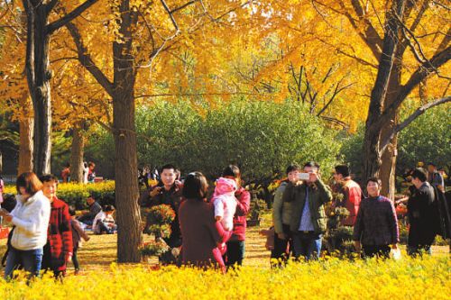 2014年11月9日,游客在香山公园金黄色的银杏树下拍照留念。