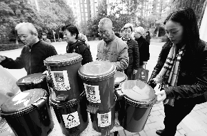 27日,北京市朝阳区东湖街道开展以“垃圾分类益处多整洁社区靠你我”为主题的宣传活动。主办方希望通过这项活动让更多的居民树立垃圾分类意识,更好地保护生存环境。图为在北京澳洲康都小区,社区居民在领取垃圾桶。首席摄影记者 蔡代征 摄