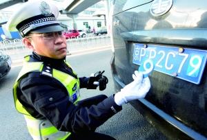 短短10分钟就查处了6起违法,交警解释,很多司机遮挡、变造号牌并非因为限行,“主要就是为了走快速公交车道,逃避执法。”记者从交管部门获悉,昨天7时30分到9时,交警在朝阳路共查处42起交通违法行为,其中13起为涉牌案件。(岳亦雷/文 吴宁/摄)