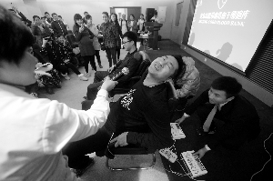 “不行了!停!”坐在椅子上双手紧抓扶手,一脸“狰狞”龇牙咧嘴大喊叫停的是正在体验分娩阵痛的准爸爸们。两对电磁极贴片被绑定在他们的腹部,启动电源开关,几分钟之内从一股针刺感的轻微疼痛逐渐加量到二级、三级痛感。据现场操作人员介绍,分娩阵痛体验仪器分为五级痛感,但即便开到最大的五级阵痛也只有真实分娩的一半疼痛,因为女人生孩子的疼痛级别达到了十级。而现在体验的男士中忍痛能力最强的一位也只坚持到三级半就纷纷叫停。“就像一只手揪住你的五脏六腑要往外拽的疼,真心忍不了!”“老婆,你太不容易了!”