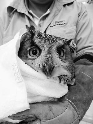 昨天,记者前往救助中心,见到了这只编号为151021的猫头鹰。透过室外笼舍的门缝看到,它身长70厘米左右,停在离门一米多远的横栏上,当发现有人在看它时,并没有表现出丝毫的紧张,还不时与记者四目相对。