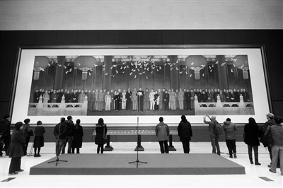 值得一提的是,《新中国诞生》旁边挂着的就是画家董希文在新中国成立初期所绘制的经典油画《开国大典》,同一题材的两幅作品异曲同工。中央大厅位处国家博物馆的中心,“馆藏现代经典美术作品展”在四年多的展出时间内,尤为引人注目,因为它们都是新中国成立以来最重要的革命历史主题美术创作,不仅在新中国美术史上占有重要的地位,而且与无数的参观者都有着在以往教育方面的联系。摄影/本报记者 魏彤