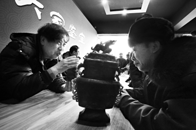 4日,在老窑瓷博物馆内,文物专家傅公钺(左)正在为收藏爱好者“鉴宝”。当天,由西城区社工委等单位主办的“文物专家进社区”活动在大栅栏街道老窑瓷博物馆举行。文物界资深专家走进社区,为社区居民鉴定收藏品,分享收藏方面的专业知识。记者 方非摄